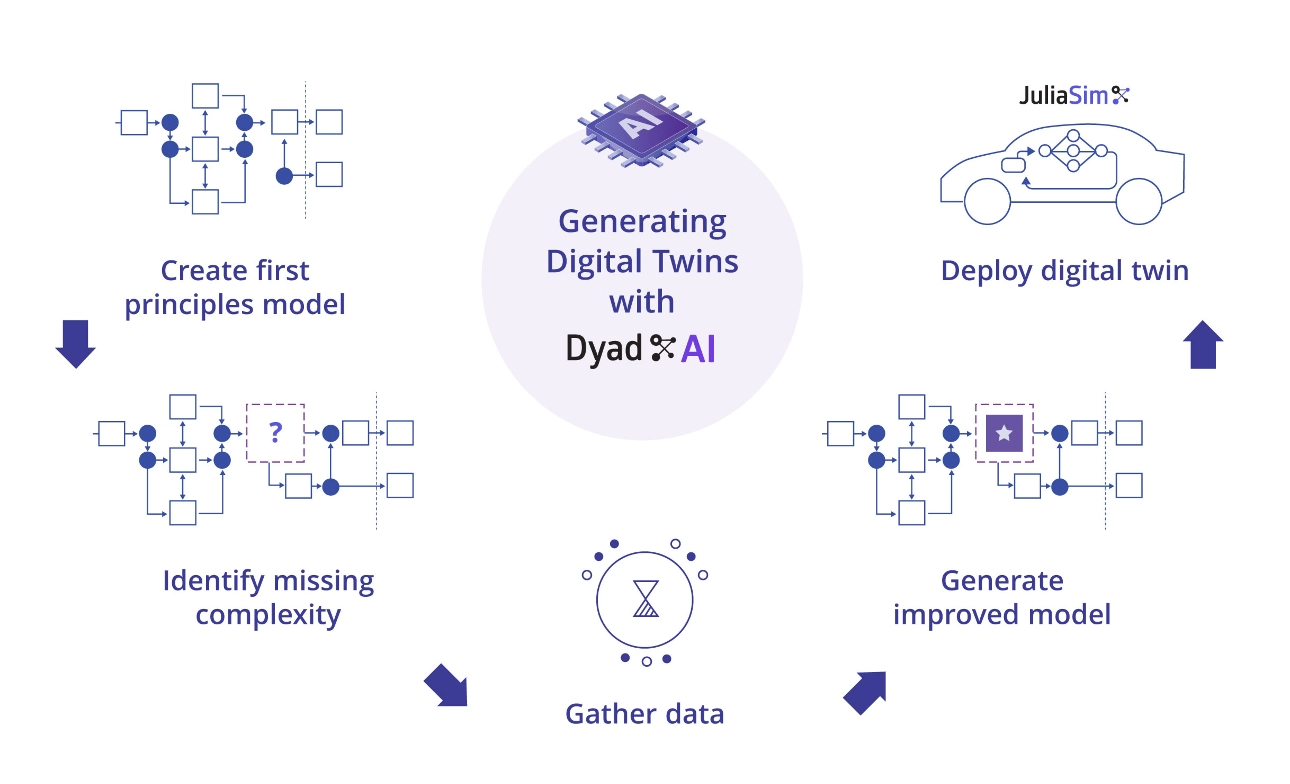 The Dyad compiler uses the physical description of the system, which maps to the block diagram representation, to generate a system of differential-algebraic equations via structural simplification: