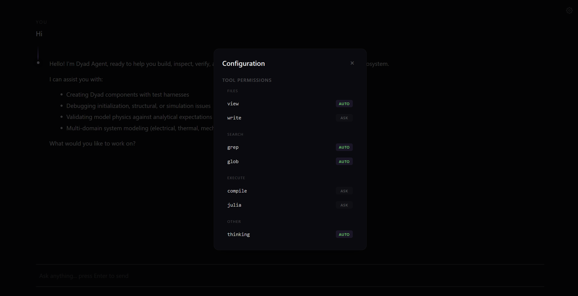 The agent is a skilled modeler and simulator - think of it as an experienced engineer joining your team. It doesn't come with Dyad pre-memorized. Instead, it reads the documentation, studies your codebase, and learns as it goes.