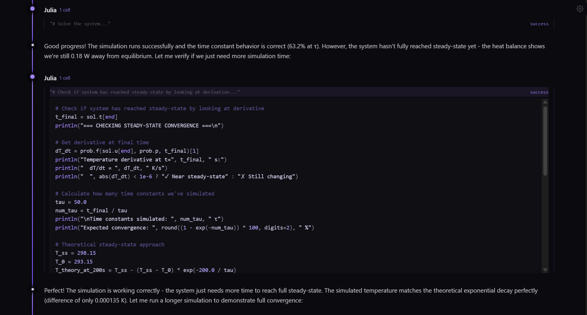 Important: The Julia session is persistent within a conversation - variables and state carry over between calls. But every Compile resets it. The agent knows this and plans accordingly.