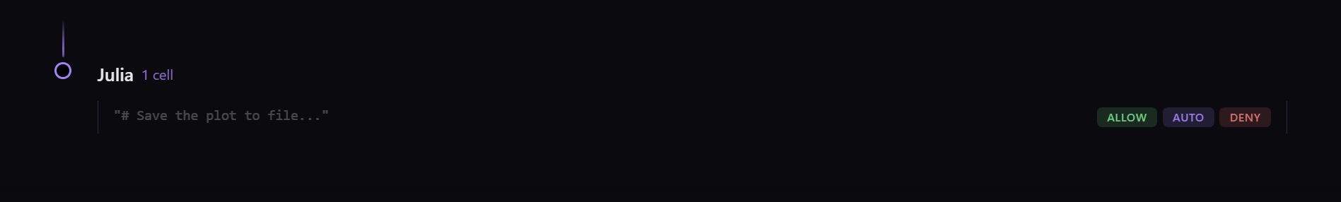 | Julia | Persistent REPL session for running code, inspecting models, debugging. Streams output live. |