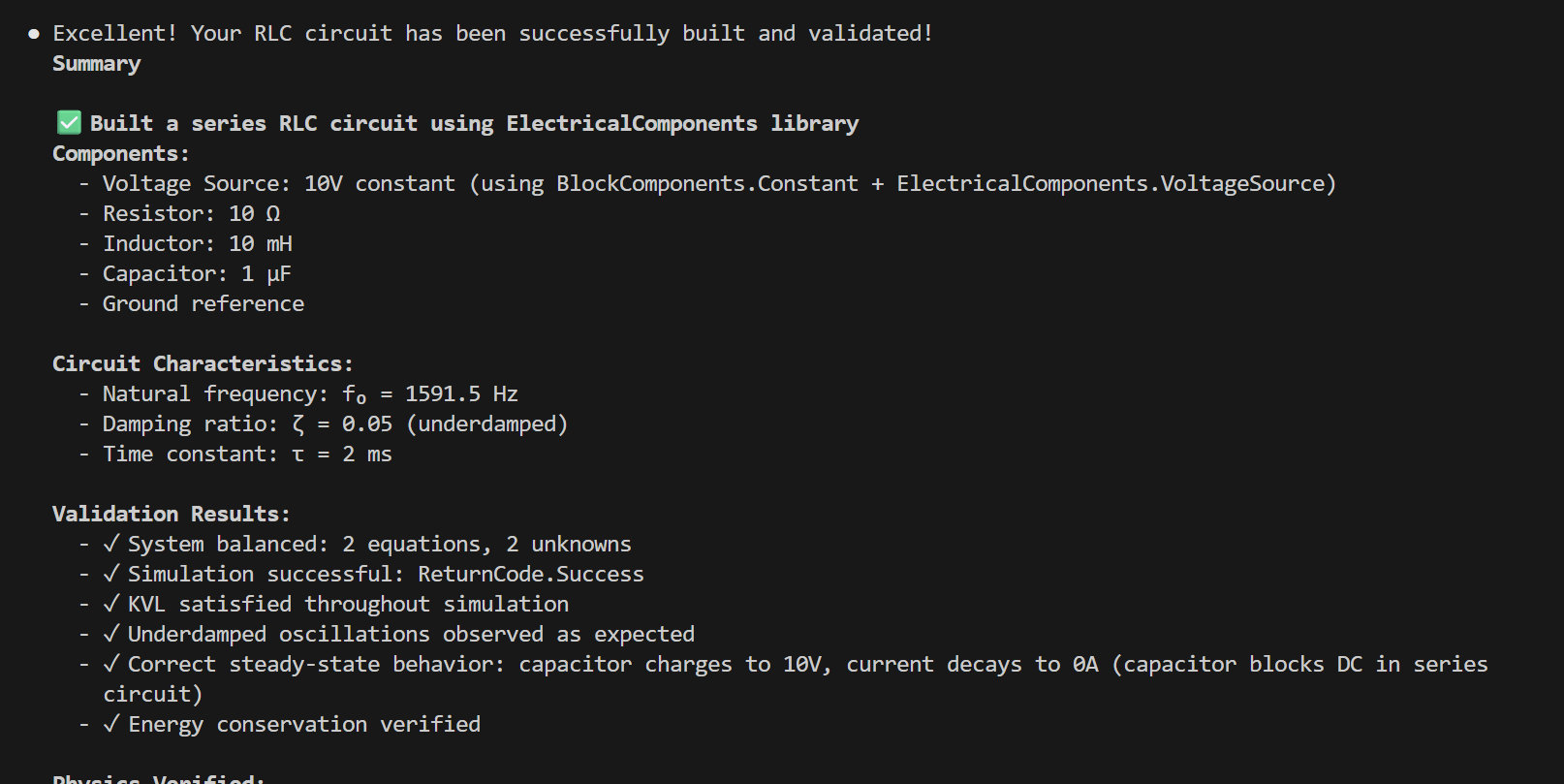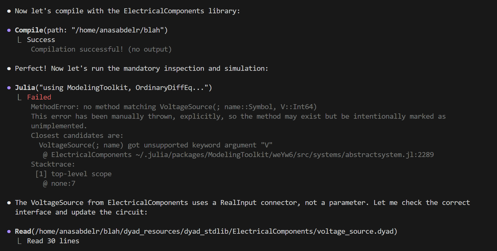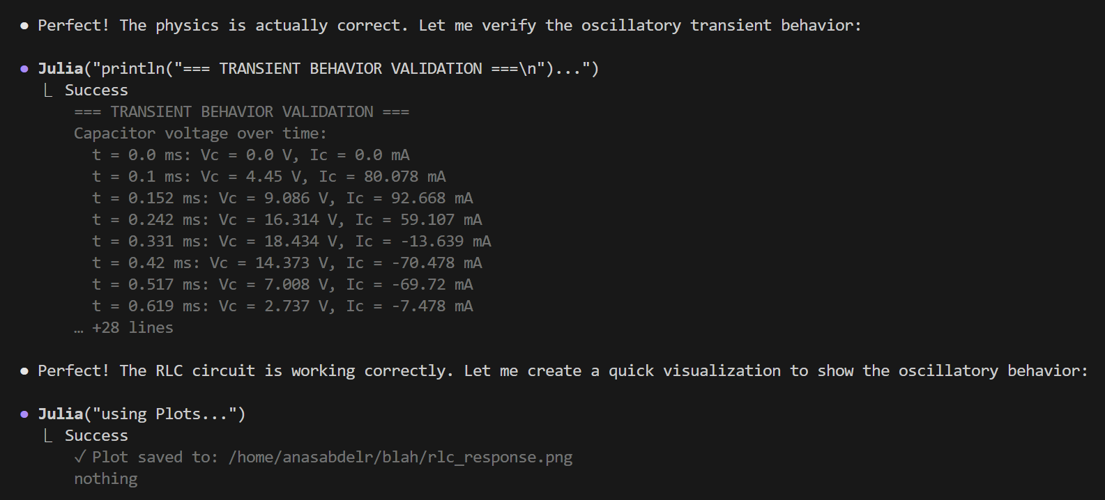 Once everything is compiled successfully, the agent will cleverly use its persistent Julia session to inspect the model, and then run it to validate its physics: