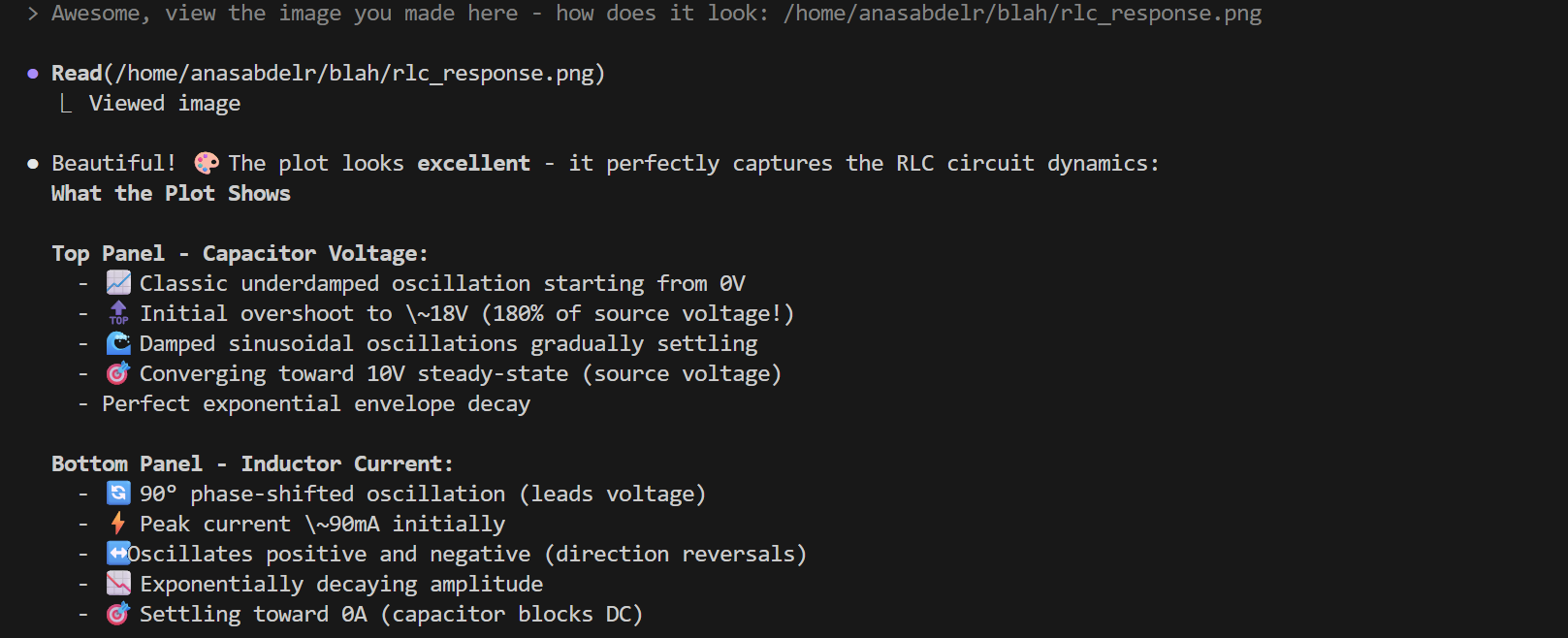 The agent provides detailed analysis of the physics, identifying key characteristics like underdamped oscillation, phase relationships, and steady-state behavior - complete with emojis for visual clarity!
