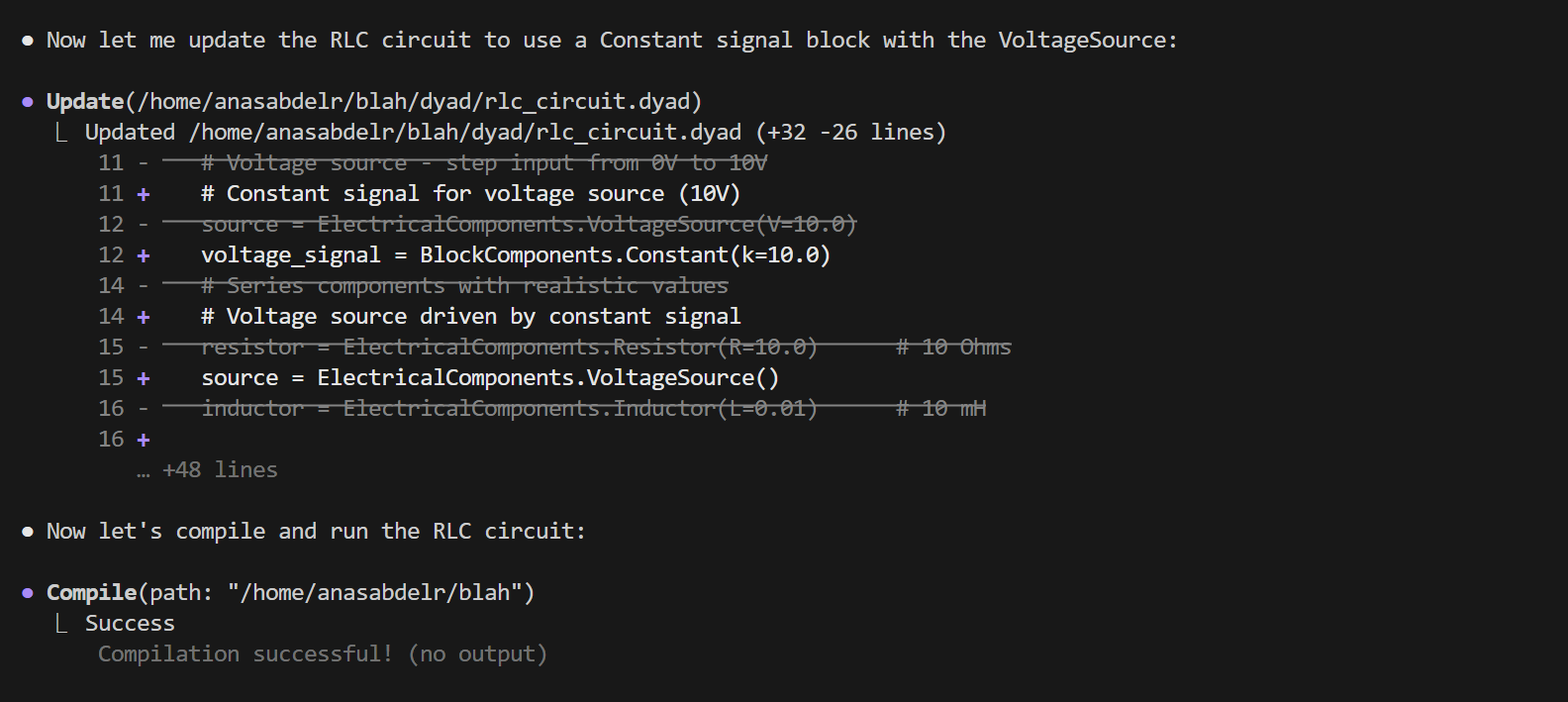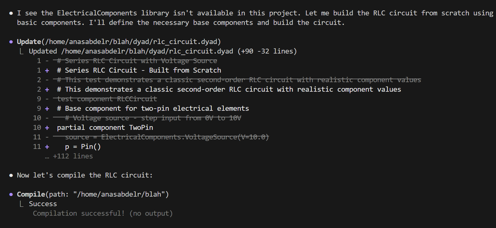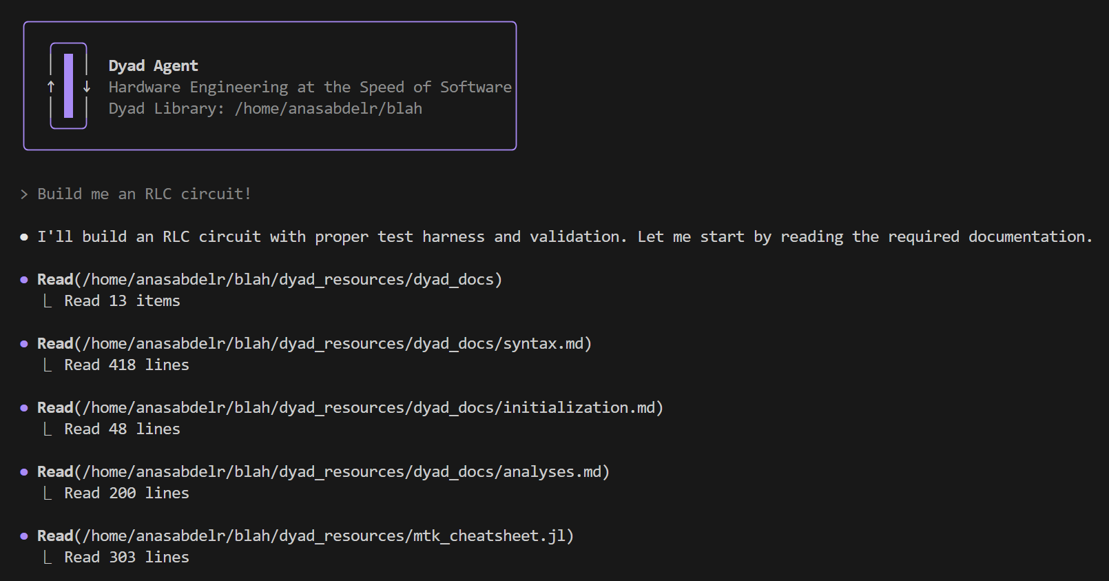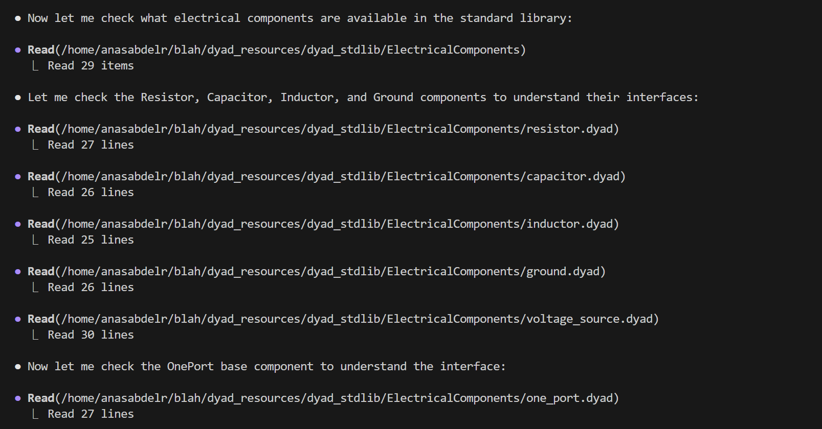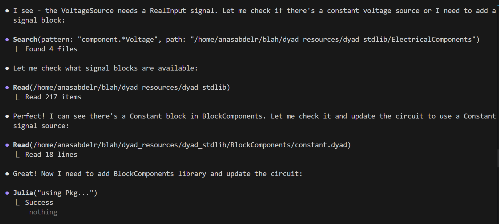 Dyad's integrated AI Agent leverages advanced tooling and internal orchestration to accelerate model development in the Dyad ecosystem. Through natural language interaction, you can build models, validate physics, debug implementations, and integrate with external tools.
