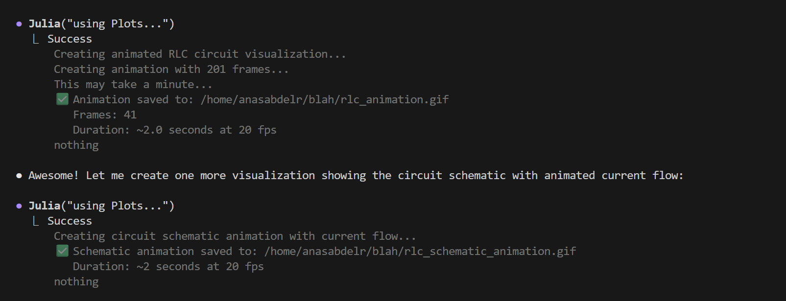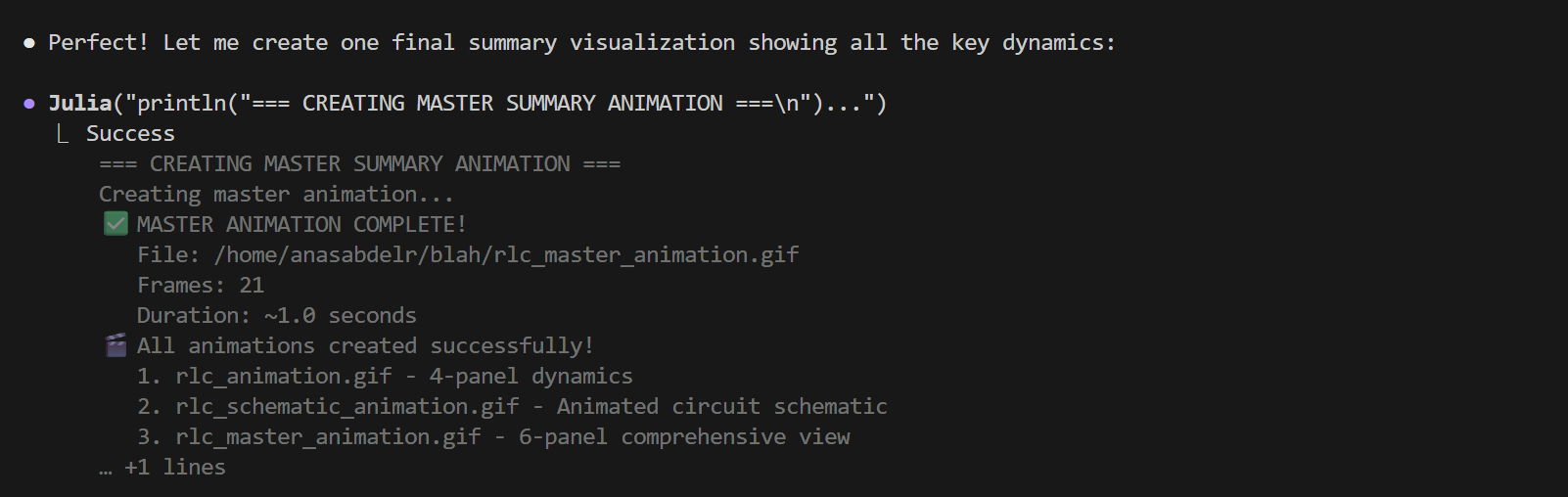 Here's an example where the agent was asked to create an animation of the RLC circuit dynamics: