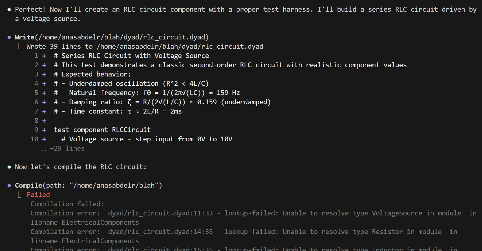 Since in this case we did not add ElectricalComponents before the agent began, the agent will run into a compile error after it writes and compiles its code: