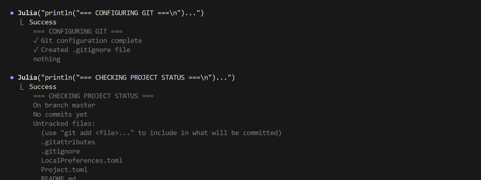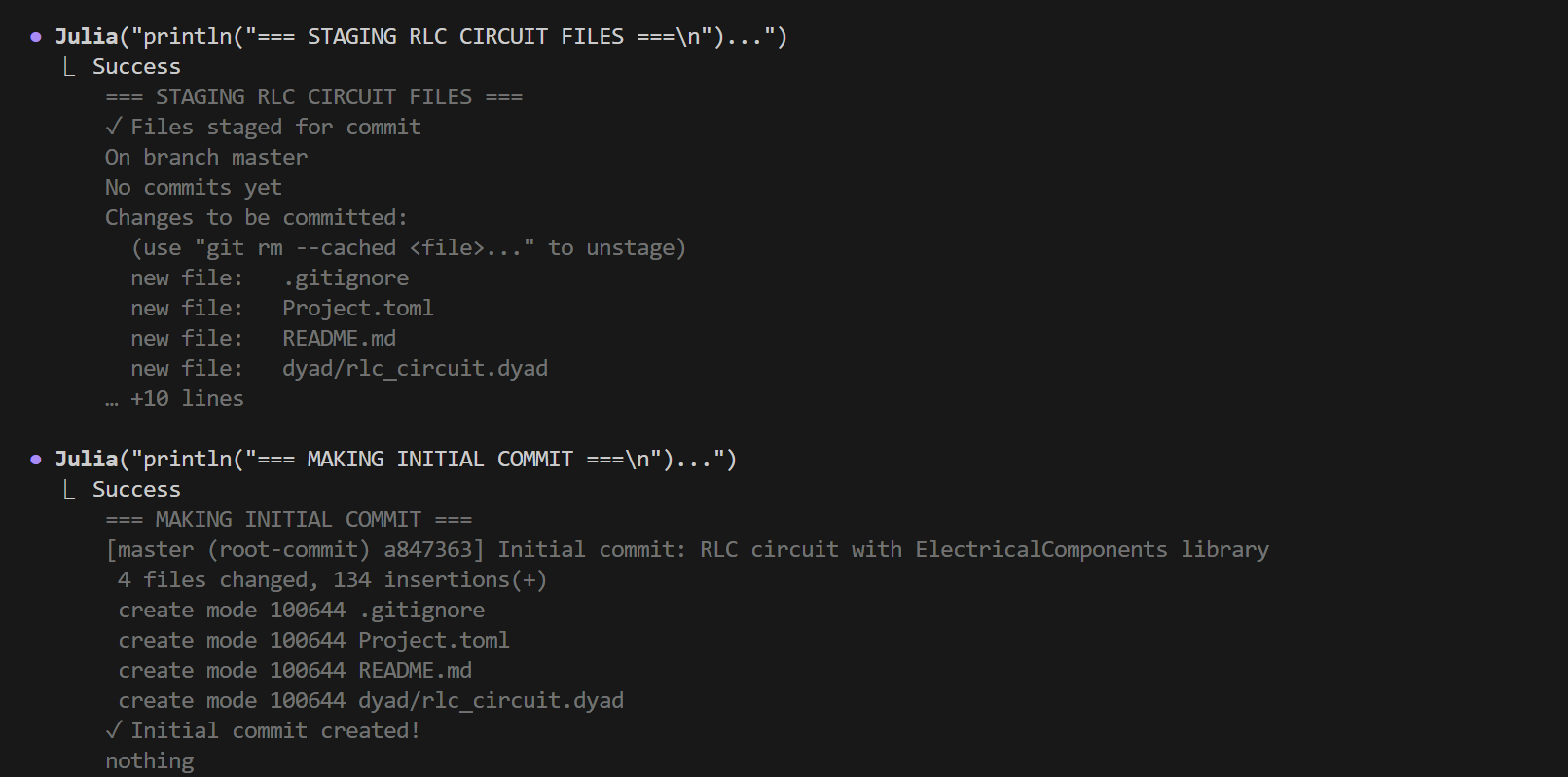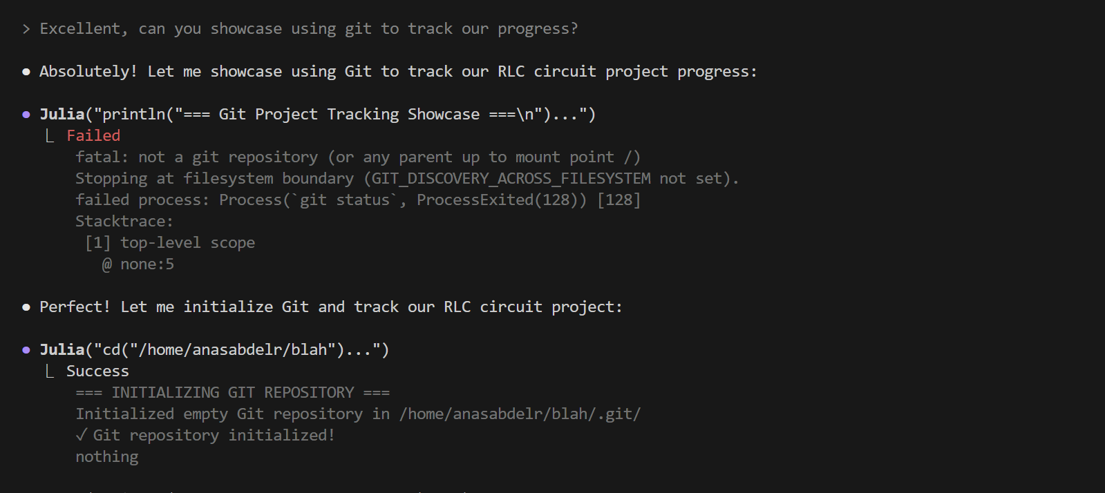 The agent can use Git through the Julia tool to track your modeling progress. You can ask it to initialize a repository, stage files, and create commits.