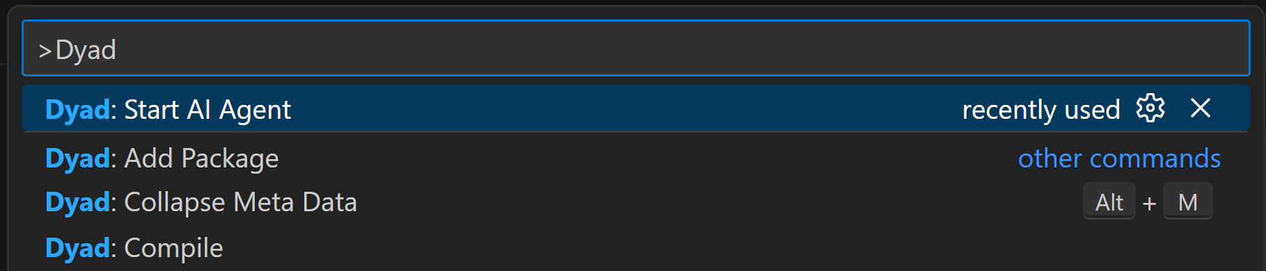 Start the agent via the VS Code command palette by using the Cmd/Ctrl-Shift-P keyboard shortcut or clicking on View > Command Palette on the VS Code toolbar. You can then type in "Dyad: Start AI Agent" like below, and then press Enter.